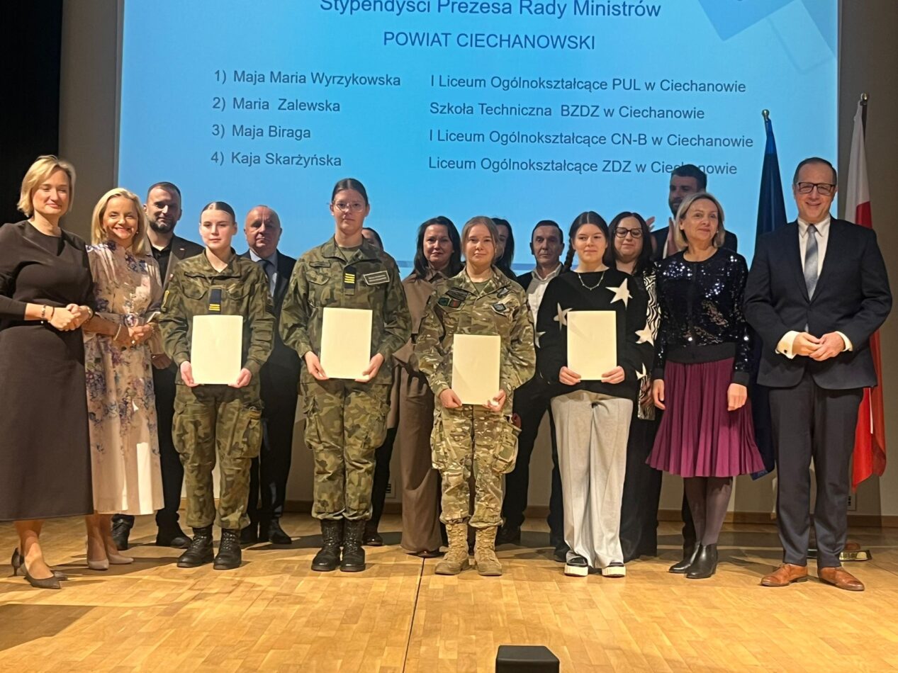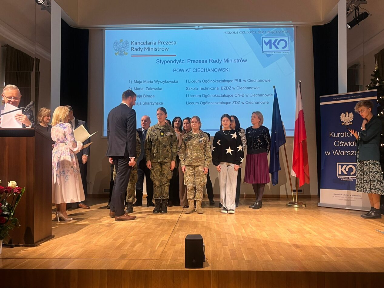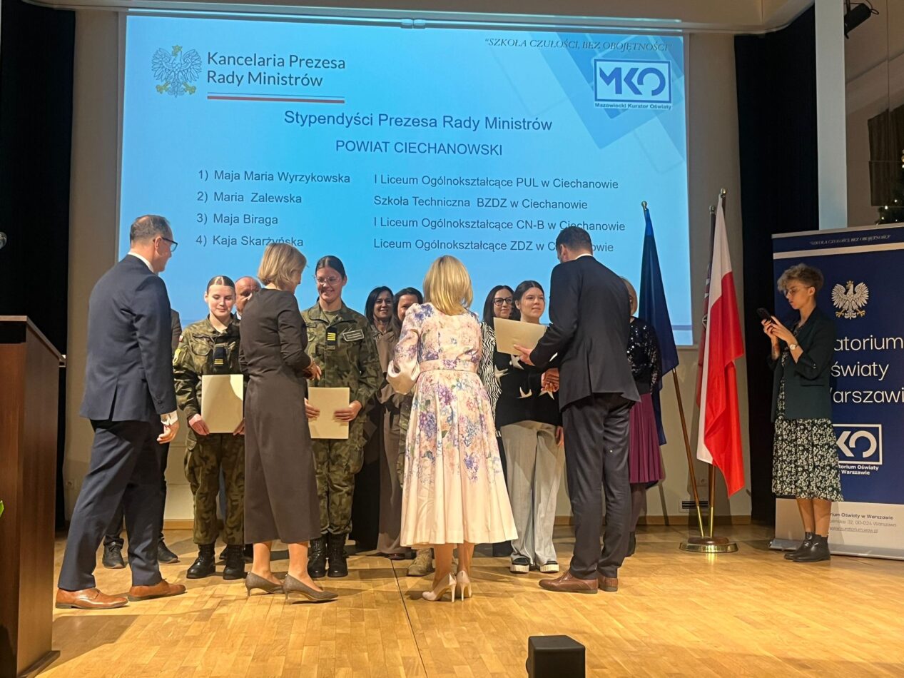 Uczennice naszej szkoły Maria Zalewska z klasy 4A technikum i Dominika Jakubiak z klasy 3 LO zostały wyróżnione stypendium Prezesa Rady Ministrów za wysokie wyniki w nauce. Uroczysta gala związana z wręczaniem nagród odbyła się 8 grudnia w Opinogórze z udziałem Mazowieckiego Kuratora Oświaty p. Wioletty Krzyżanowskiej i licznie zaproszonych gości. Wyróżnionym uczennicom serdecznie gratulujemy.
