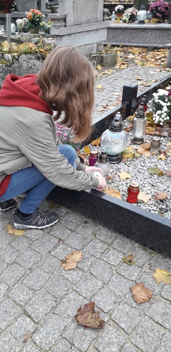 6.  Na cmentarzu parafialnym w Glinojecku znicz zapaliła Justyna Frankowska z kl. I