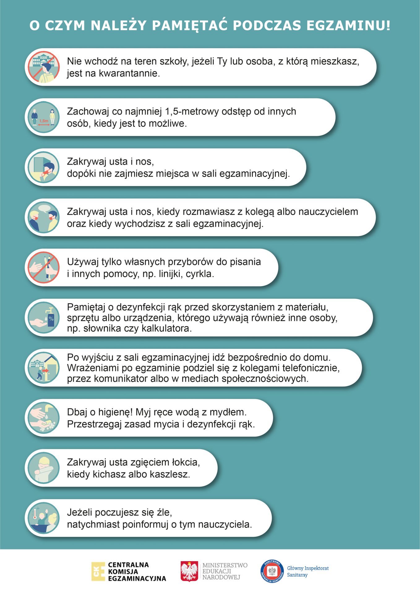 Egzaminy maturalne w naszej szkole dobiegły końca. Od poniedziałku rozpoczynamy egzaminy potwierdzające kwalifikacje w zawodzie zgodnie z ogłoszonym wcześniej harmonogramem. Przypominamy o zachowaniu zasad bezpieczeństwa oraz zastosowaniu się do wytycznych w związku z zagrożeniem wirusem covid-19.