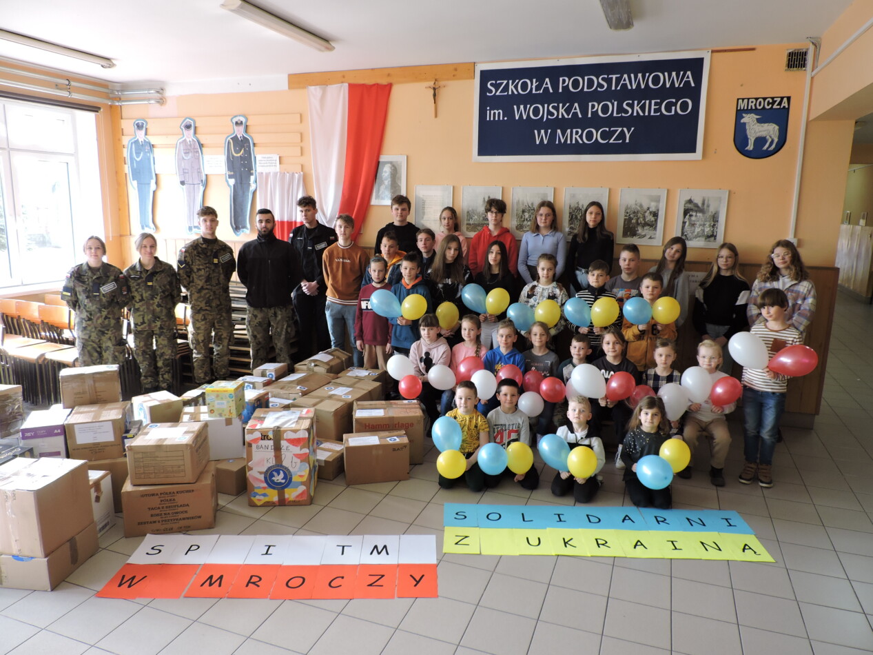 Uczniowie Szkoły Podstawowej im. Wojska Polskiego w Mroczy oraz Technikum Mundurowego BZDZ w Bydgoszczy, w związku z zaistniałą sytuacją na Ukrainie, wyrażają solidarność z narodem objętym wojną i biorą czynny udział w akcjach mających na celu niesienie pomocy zaatakowanemu sąsiedzkiemu narodowi ukraińskiemu. Młodzież wraz z opiekunami zorganizowała tygodniową zbiórkę darów.