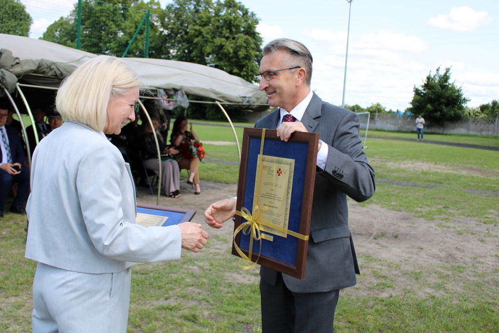 Wręczenia sztandaru dokonał Prezes Bydgoskiego Zakładu Doskonalenia Zawodowego pan Paweł Duzdowski na ręce pani dyrektor, która następnie przekazała go uczniom.